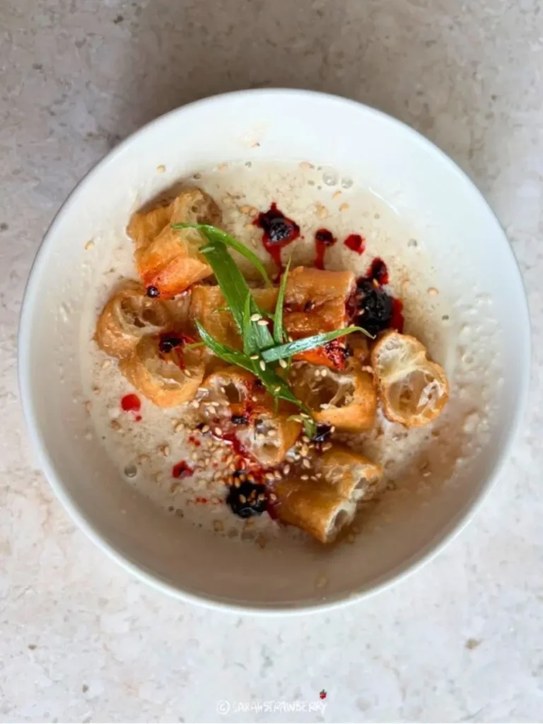Salty soymilk (鹹豆漿): Warm, savory, AND comforting! It’s a savory breakfast dish with vinegar, soy sauce, dried shrimp, and crispy youtiao. Mind-blowingly good.